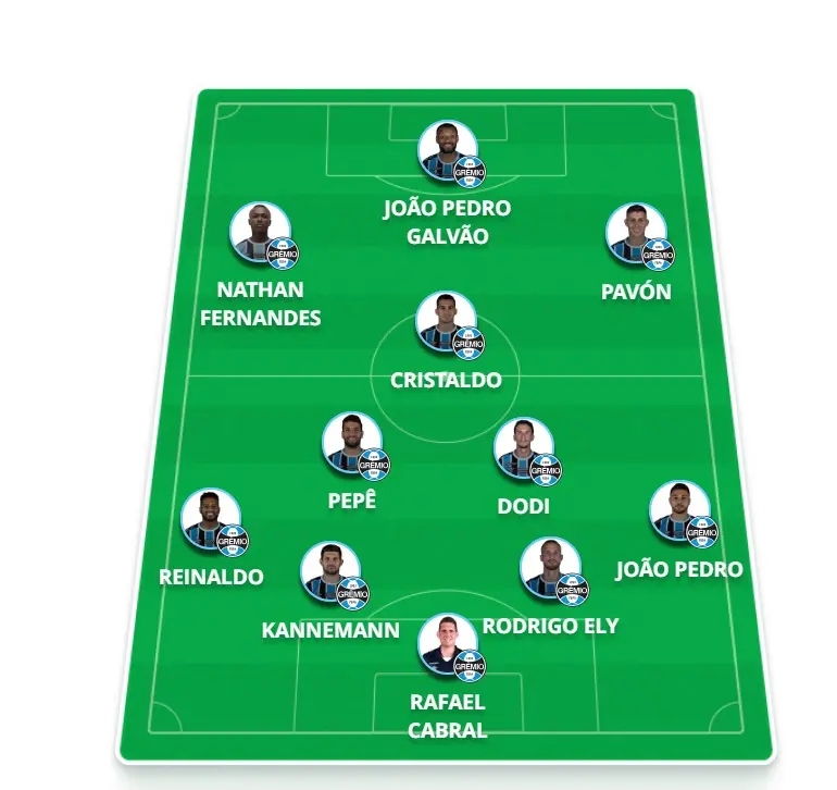 Provável time: Rafael Cabral; João Pedro, Geromel (Rodrigo Ely), Kannemann e Reinaldo; Dodi, Pepê e Cristaldo; Pavon, Nathan Fernandes (Galdino) e JP Galvão.