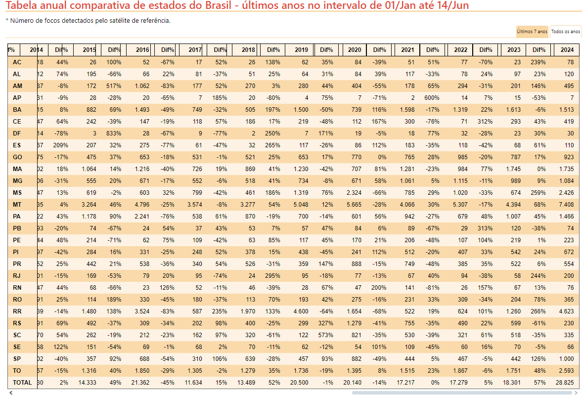 Entre os estados que tiveram redução nos focos de incêndio no mesmo período, a Paraíba aparece com -38%, Amapá com -53% e Rio Grande do Sul com -62%. Entre os biomas do Brasil, apenas os Pampas tiveram redução, com -80%, enquanto o Pantanal marcou um crescimento alarmante, de 1.418%