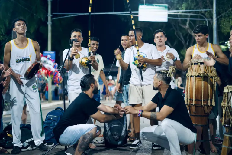 A terceira noite do Festival da Macaxeira, que acontece em Rio Branco, na Praça da Revolução, contou com uma roda de capoeira do grupo Cordão de Ouro. O grupo fez uma roda de capoeira que chamou atenção da população que passava pelo local e parou para assistir.