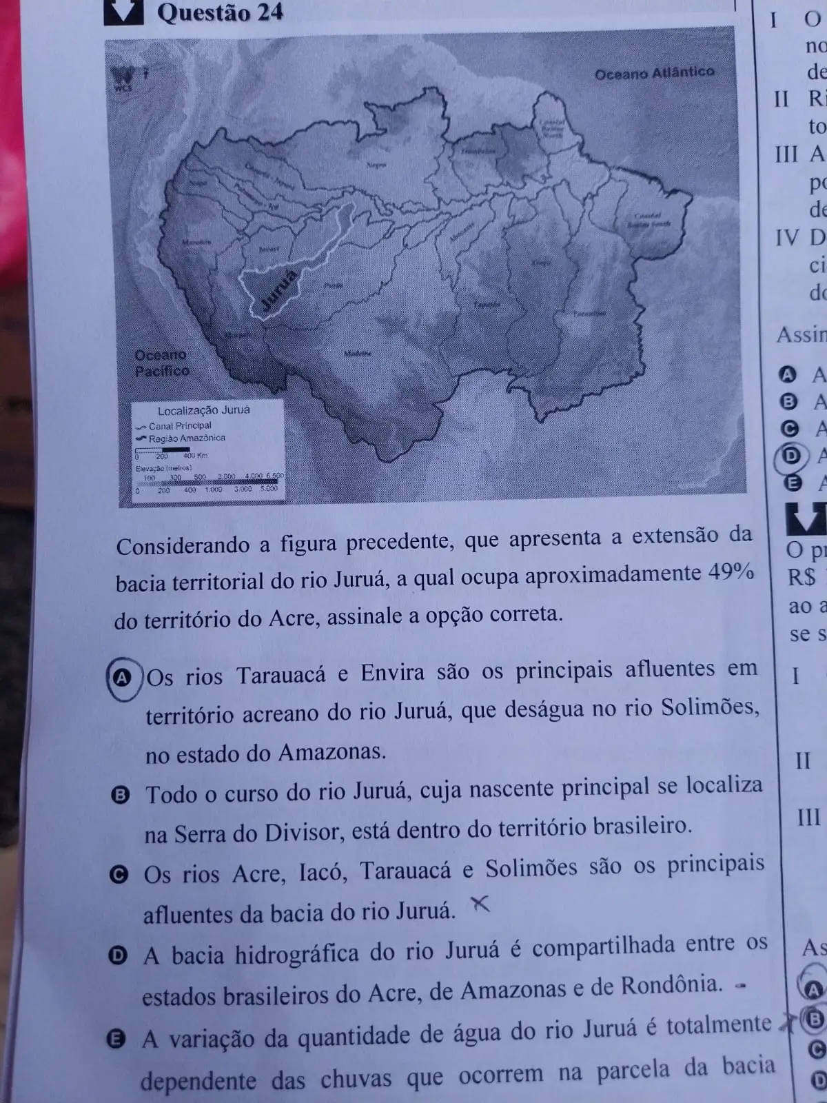 Segundo Friale, a questão 24, que se refere ao Rio Juruá, não tem alternativa correta. Para o pesquisador, a mais coerente seria a letra ‘E’ [do caderno de questões analisado], que aponta os rios Tarauacá e Envira como afluentes do Rio Juruá.