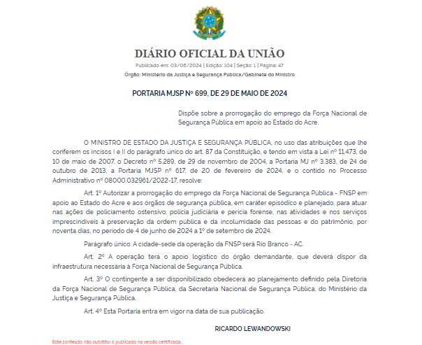 “Autorizar a prorrogação do emprego da Força Nacional de Segurança Pública – FNSP em apoio ao Estado do Acre e aos órgãos de segurança pública, em caráter episódico e planejado, para atuar nas ações de policiamento ostensivo, polícia judiciária e perícia forense, nas atividades e nos serviços imprescindíveis à preservação da ordem pública e da incolumidade das pessoas e do patrimônio, por noventa dias”, diz trecho da portaria.