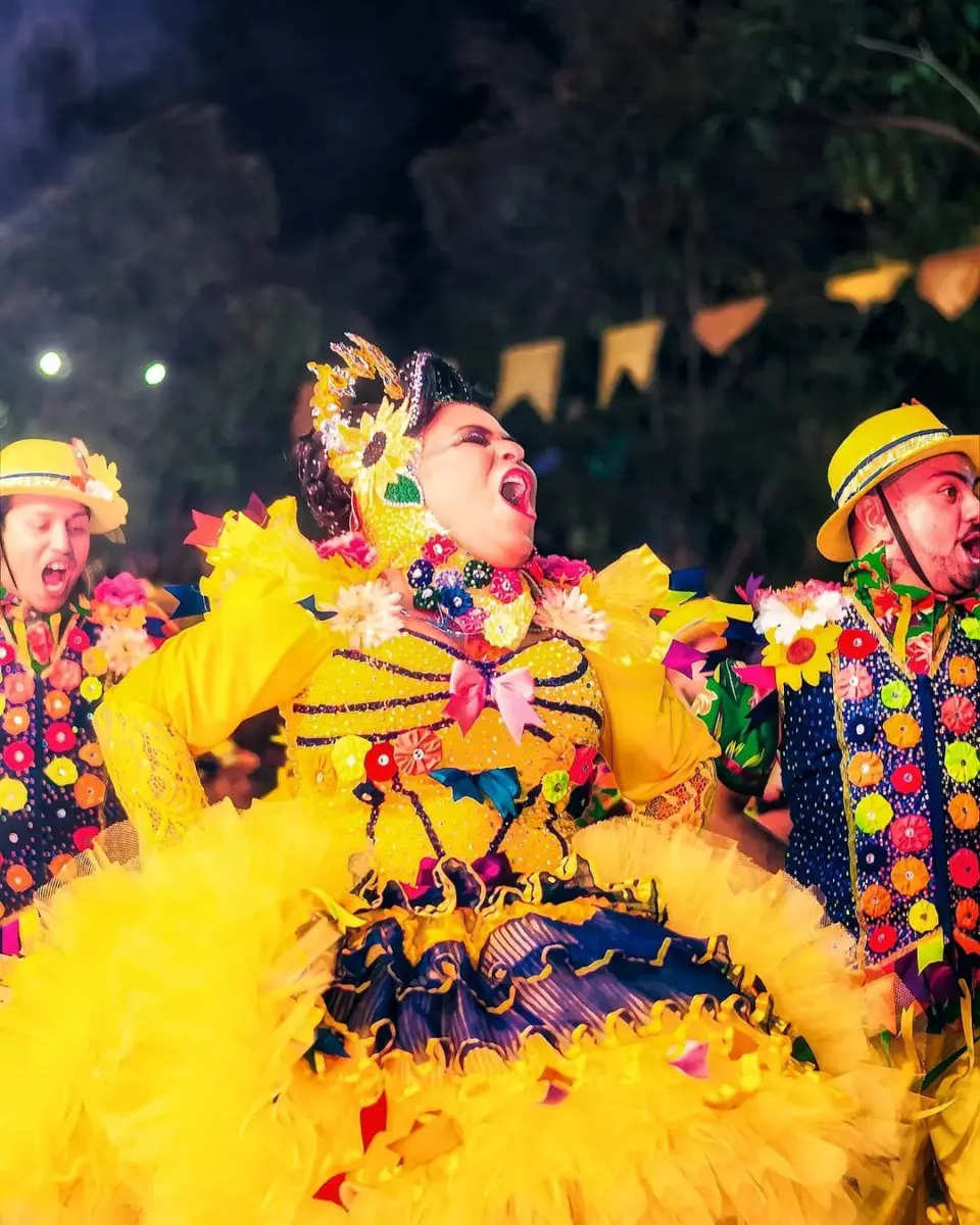 Junina Pega-Pega: A estreia é sempre um misto de emoções, mas podemos dizer que foi uma experiência extraordinária. Independentemente de ser um brincante antigo ou novato, cada apresentação é única e carregada de significados. A energia do público, a vibração das músicas e a união entre os brincantes criam momentos inesquecíveis e fazem com que cada apresentação do espetáculo seja única e especial. Além disso, este é um ano atípico para todos nós, pois perdemos uma referência para o grupo, que foi a nossa Rainha Helem Sandra.