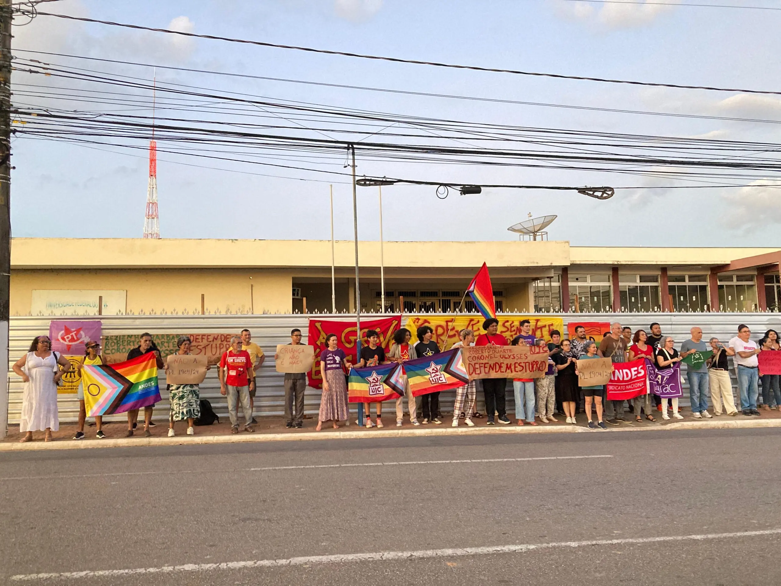 Manifestantes seguram faixas e cartazes em protesto contra a PL 1904/24, em frente ao Colégio Aplicação/Foto cedida