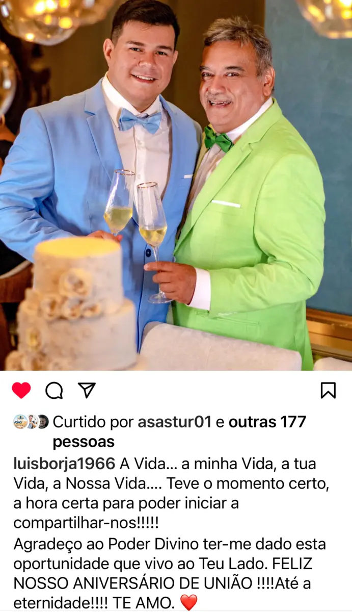 Para marcar o momento especial, Luiz Fernando Borja compartilhou uma emocionante declaração de amor e gratidão pelo esposo nas redes sociais. Em uma postagem comovente no Instagram, o médico expressou a profundidade de seus sentimentos, destacando os momentos especiais e a cumplicidade construída ao longo dos anos.