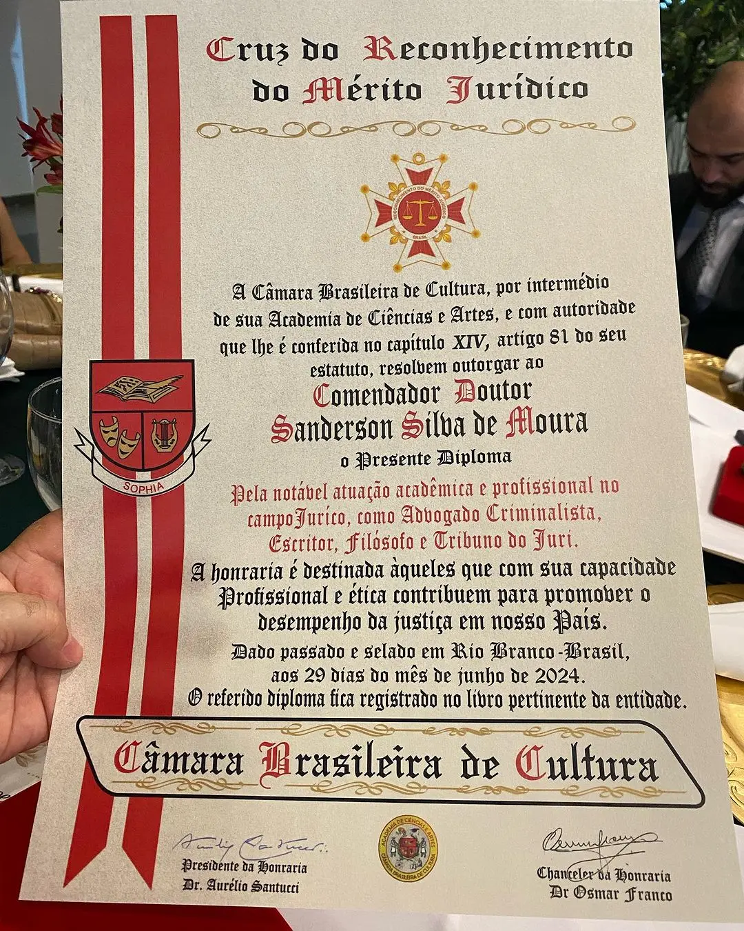 “Recebendo a Cruz do Reconhecimento do Mérito Jurídico pela Câmara Brasileira de Cultura”, declarou Sanderson/Foto: Reprodução