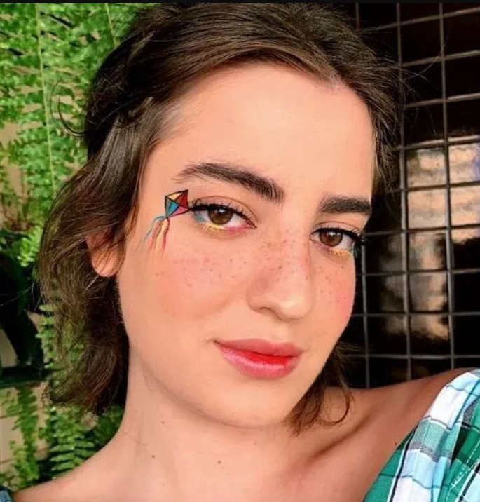 Para aquelas que amam se jogar na criatividade, também é possível brincar com o delineado. A ideia é torná-lo longo e, ao final, desenhar as tradicionais bandeirinhas ou um balãozinho. Para dar um up, use maquiagens coloridas.