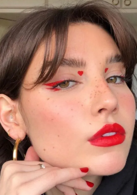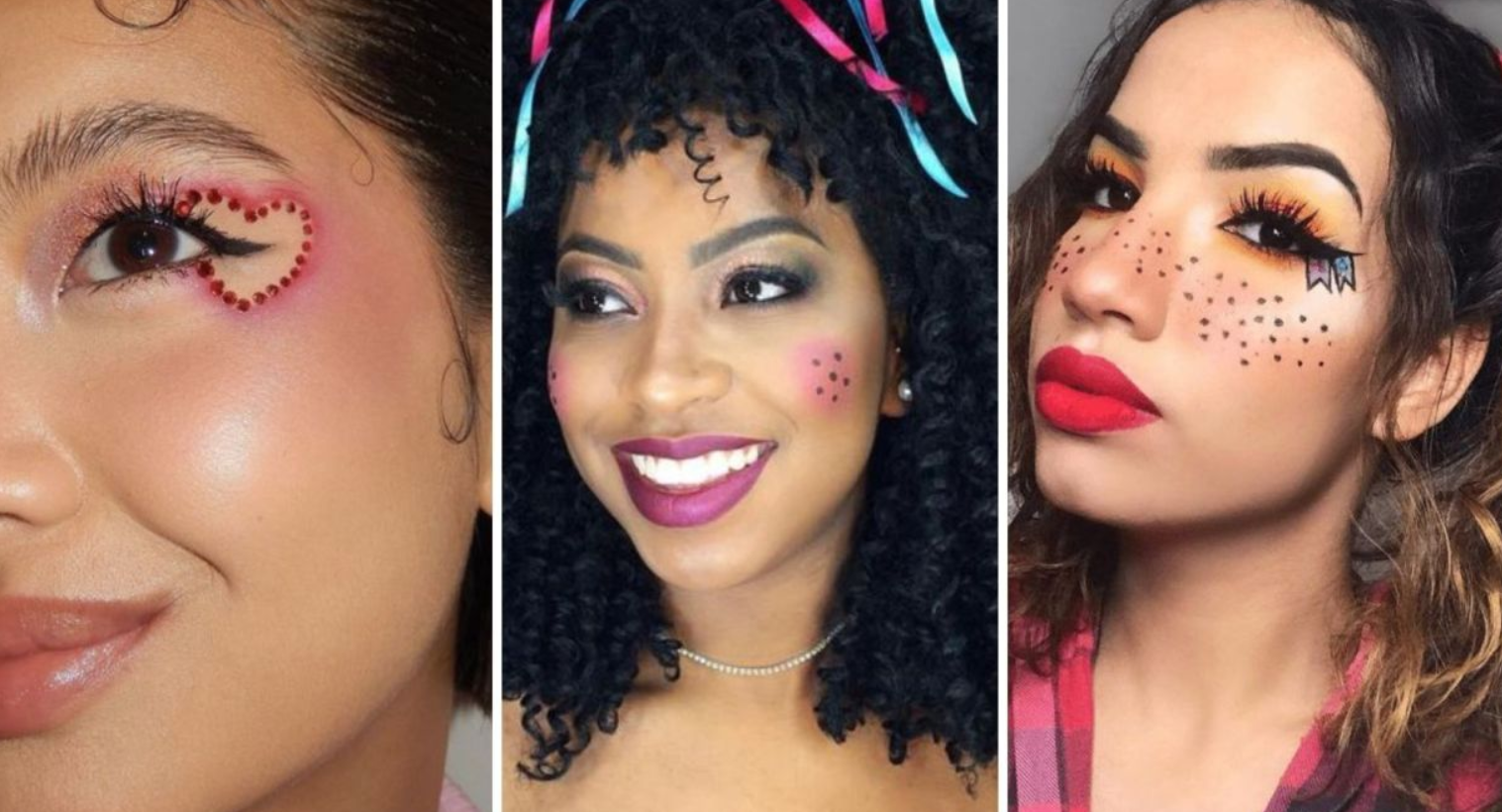 Finalizando a lista com a estética romântica, brinque ao desenhar pequenos corações vermelhos na altura da bochecha ou, ainda, acima dos olhos, bem na parte interna.