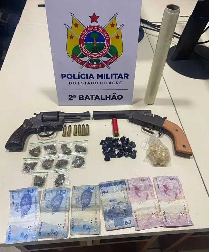 A Equipe Tática do 2° Batalhão foi acionada para verificar a denúncia e, ao chegar ao local, avistou um indivíduo fugindo com uma pequena bolsa preta, suspeita de conter drogas. Durante a perseguição, os policiais encontraram um pacote plástico transparente com entorpecentes em cima de uma mesa na cozinha da residência. Além disso, dentro da casa foram localizadas duas armas de fogo: um revólver calibre .38 com 6 munições intactas e uma escopeta calibre .28 com uma munição intacta.