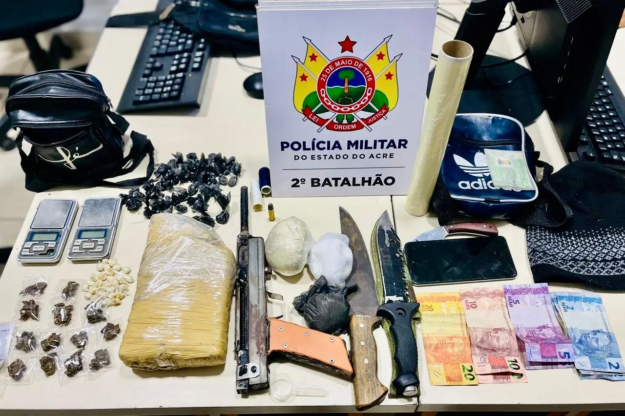 Na noite de quarta-feira, 12, a Polícia Militar efetuou a prisão de dois indivíduos por tráfico de drogas e porte ilegal de arma de fogo na travessa Ipê Roxo, ramal da Castanheira, situado no bairro Vila Acre.