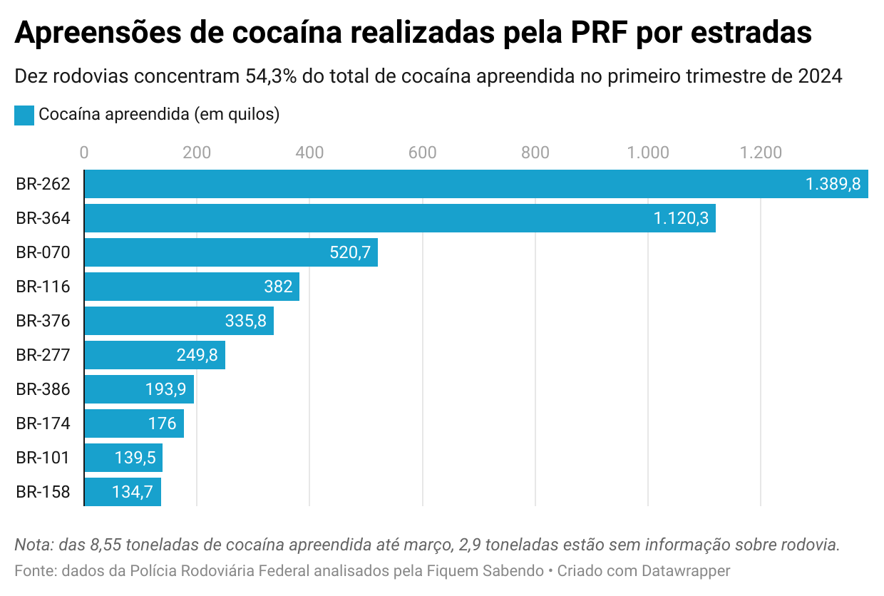 Nos números de 2024, a BR-364 ocupa o segundo lugar no número de apreensões de cocaína. Apenas neste ano, foram 1, 12 toneladas na rodovia.