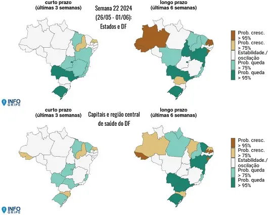 Junto com o Acre, os estados que apresentam tendência a longo prazo são Amazonas, Paraná, Paraíba, Rio Branco do Norte e Sergipe. Rio Branco também está entre as capitais que se destacam com aumento no número de casos, junto com Aracajú (SE), Florianópolis (SC), João Pessoa (PB), Manaus (AM), Natal (RN) e São Luís (MA).