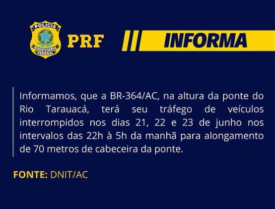 Em nota divulgada na internet, a Polícia Rodoviária Federal (PRF) informou sobre a interrupção no tráfego de veículos na BR-364, mais precisamente na ponte sobre o Rio Tarauacá, nos dias 21, 22 e 23 de junho.