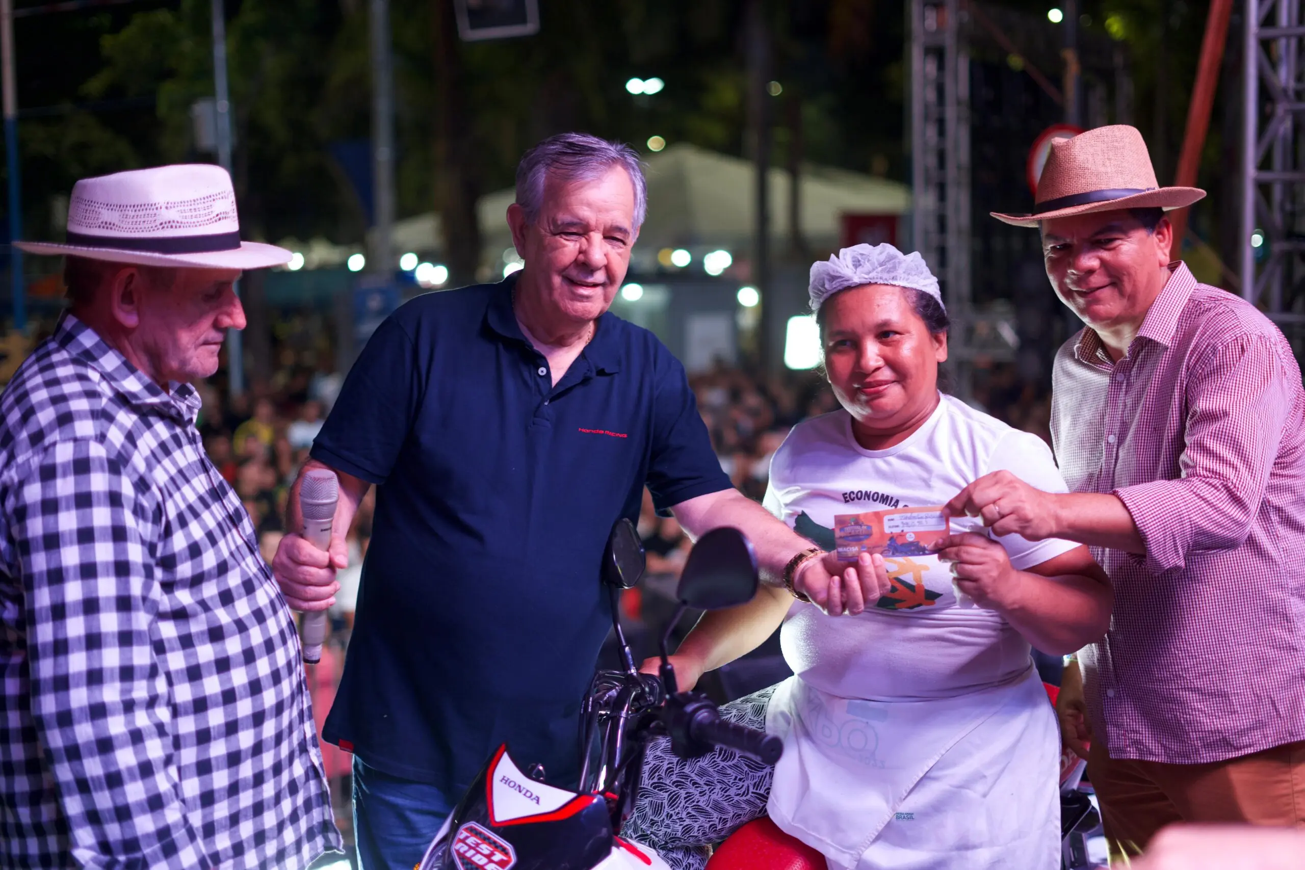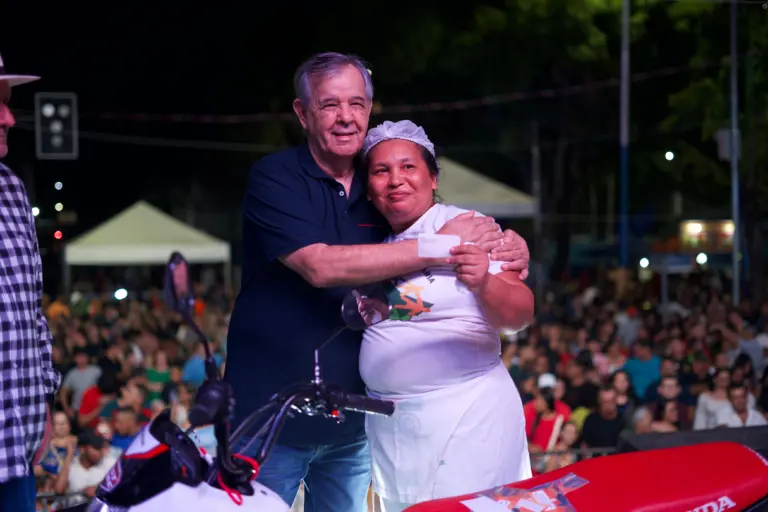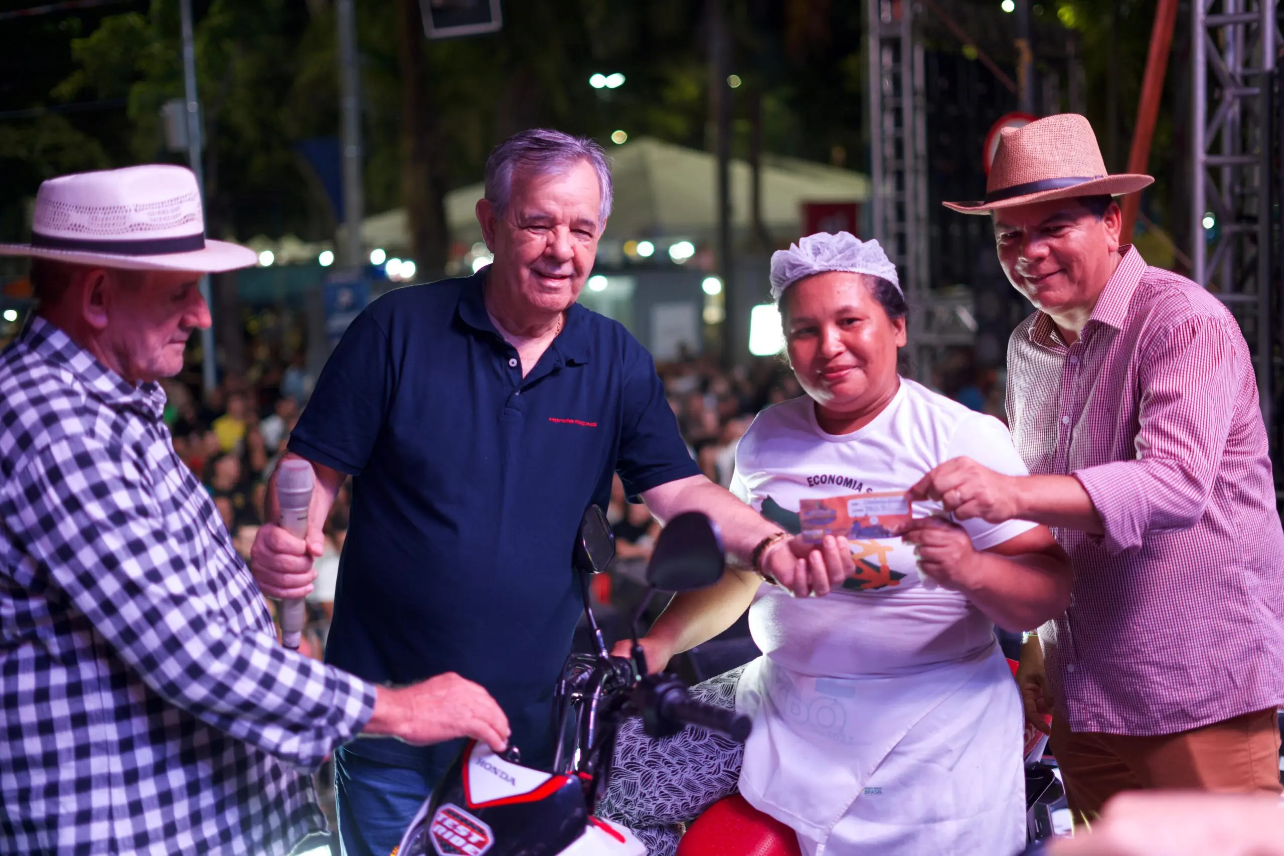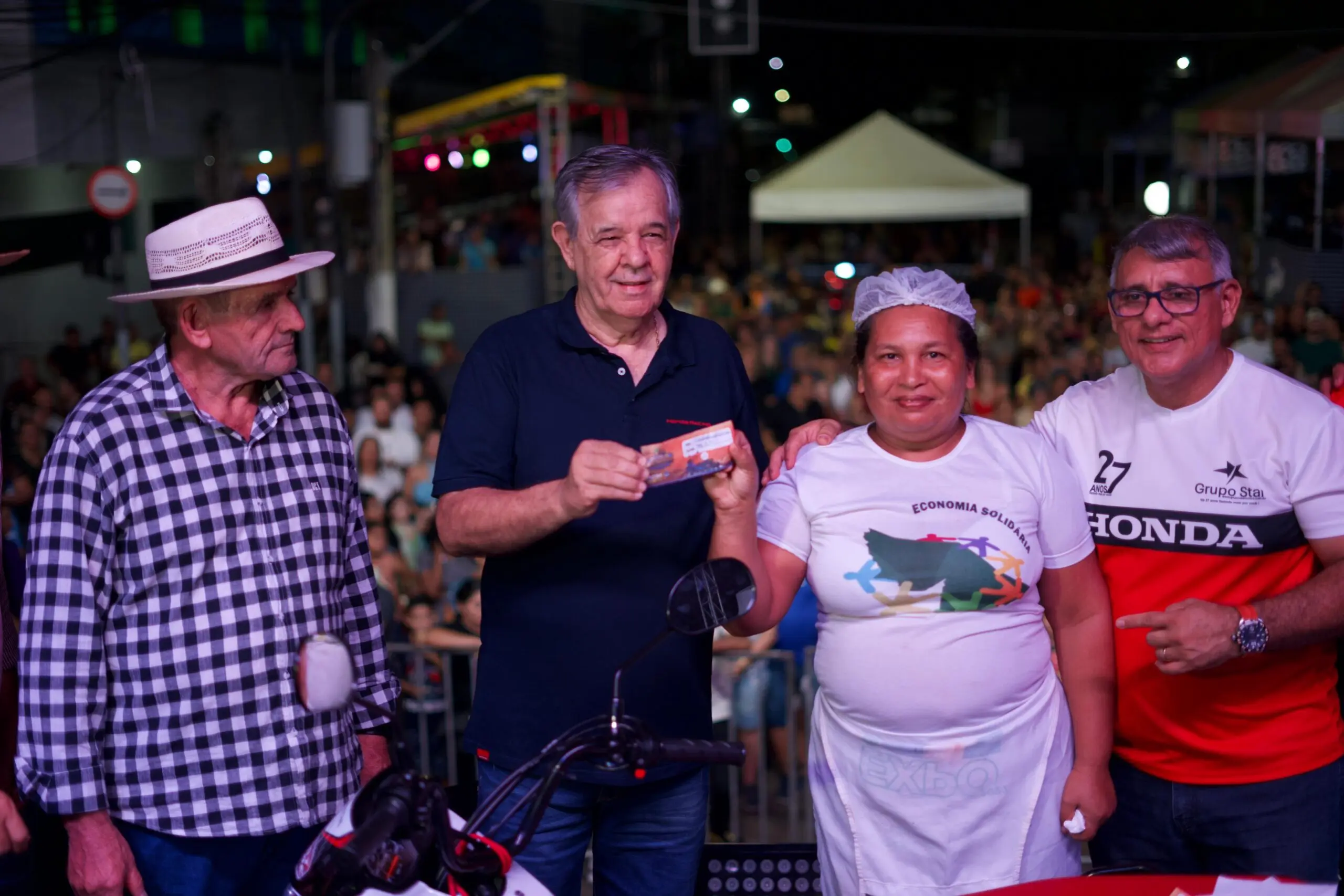 O senhor Vandernilson Bezerra de Lima, de 50 anos, foi sorteado na última noite do festival, neste sábado (29). Quem recebeu a moto foi a esposa do vendedor, a senhora Raimunda, que estava presente e confirmou os dados do marido.