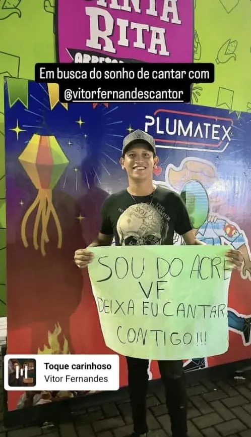 Fã dedicado, Tardely foi ao evento com um cartaz pedindo para cantar com Vitor Fernandes. O sertanejo, ao notar o pedido no cartaz, atendeu prontamente. “Eu mostrei o cartaz pra ele lá na frente do show e assim que ele viu, ele disse: ‘Você vai cantar comigo'”, contou Tardely à coluna Douglas Richer, do site ContilNet.