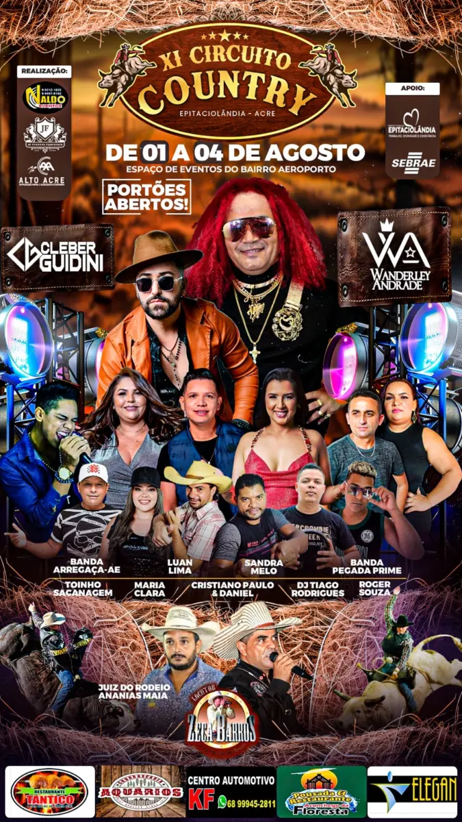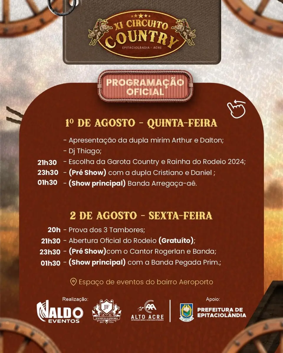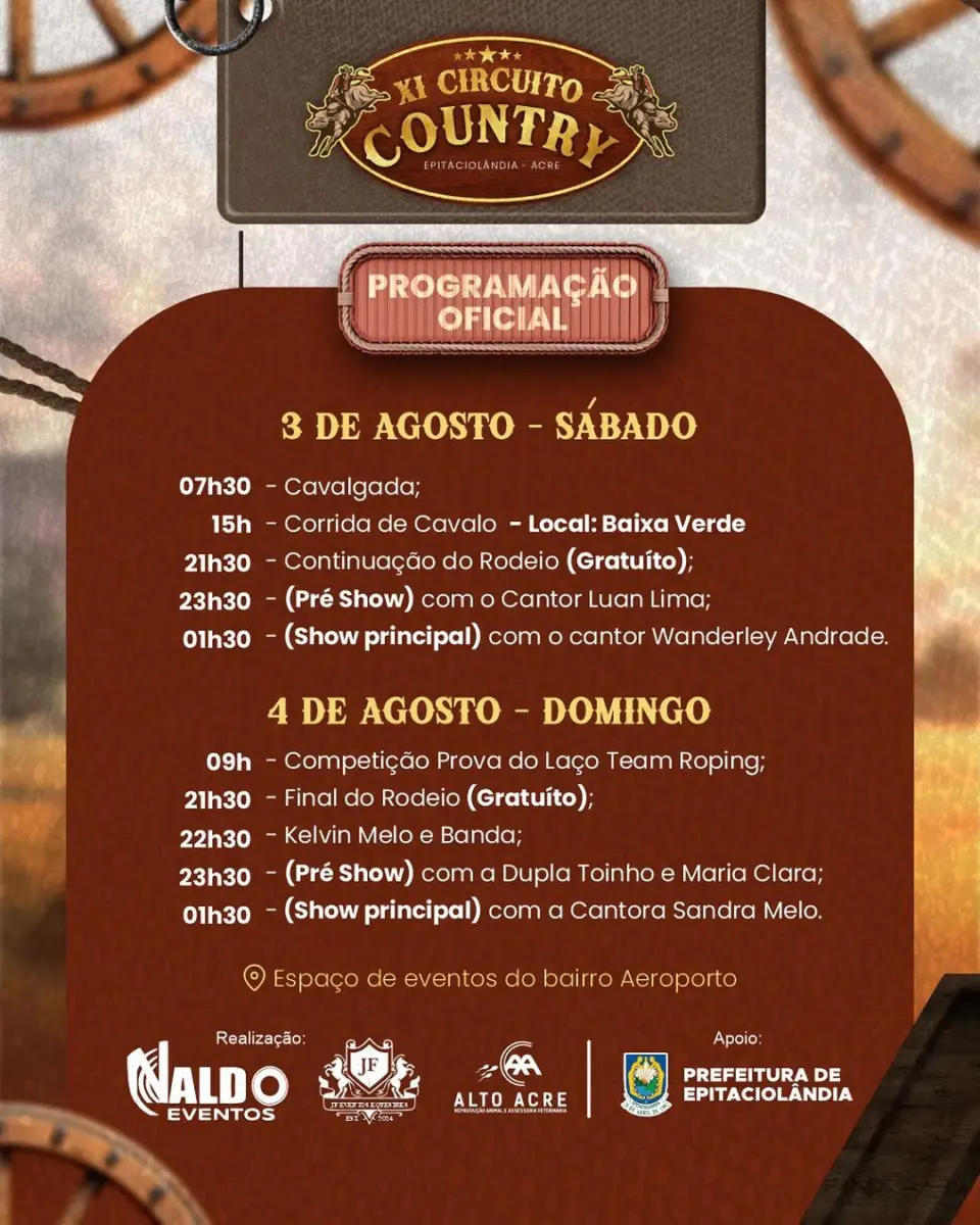 O 11º Circuito Country de Epitaciolândia está confirmado para os dias 1 a 4 de agosto, no Espaço de Eventos do Aeroporto Velho. O evento, que é uma celebração da cultura country e rodeio, promete atrair grande público com uma programação repleta de atrações.
