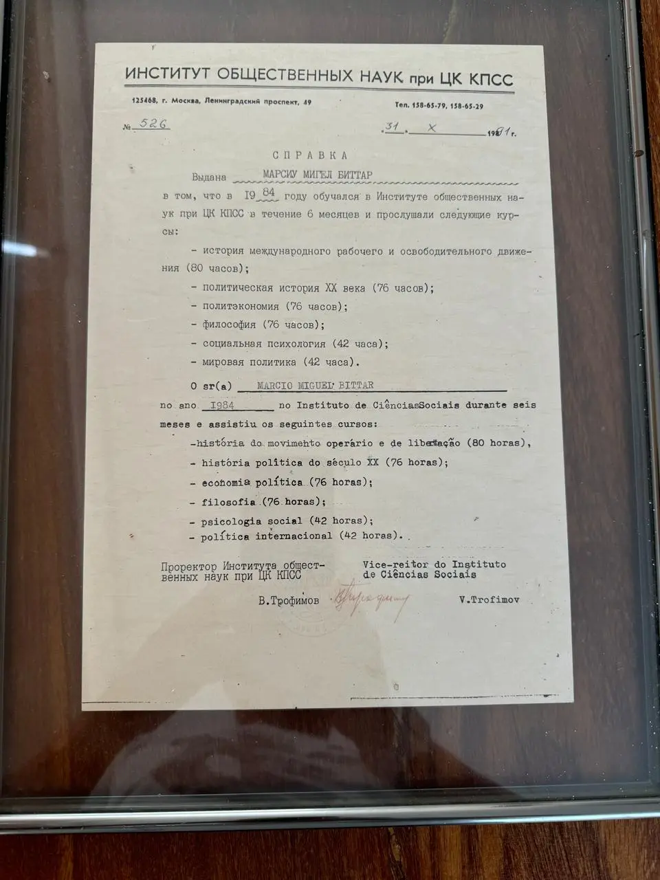 Documento inédito e em russo atesta participação do brasileiro Márcio Bittar em curso sobre ser comunista na extinta União Soviética, em 1984/Foto: Reprodução