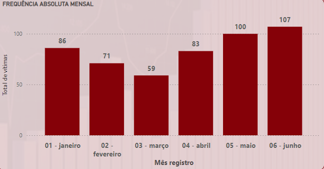 Até maio, foram registrados 399 casos, sendo 86 casos em janeiro, 71 em fevereiro, 59 em março, 83 em abril e 100 em maio. O quinto mês do ano foi, até então, o que mais ocorreu notificações do crime.