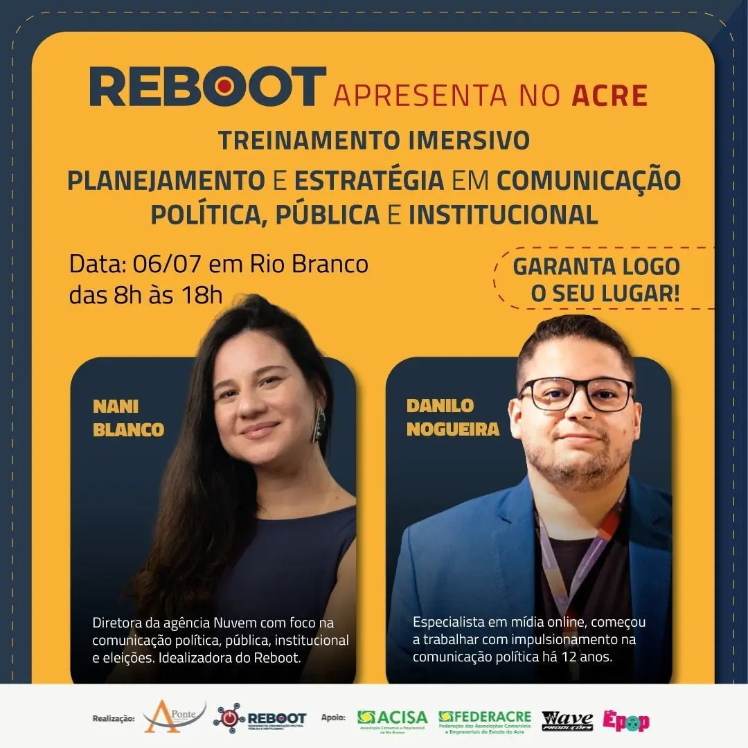 Uma das maiores marcas do marketing político e comunicação pública, política e institucional do Brasil, o Reboot, chega ao Acre no dia 6 de julho, para um treinamento imersivo de um dia inteiro sobre planejamento e estratégia em comunicação política, pública e institucional, e tráfego pago.