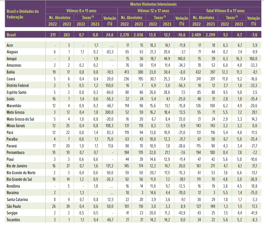 No Brasil, houve um aumento de 24,6% nas mortes violentas entre 0 e 11 anos, com o estado de Alagoas sendo o que teve a maior queda, com -83,3% de casos. Já o Mato Grosso puxa a alta do país, com 300% de crescimento.