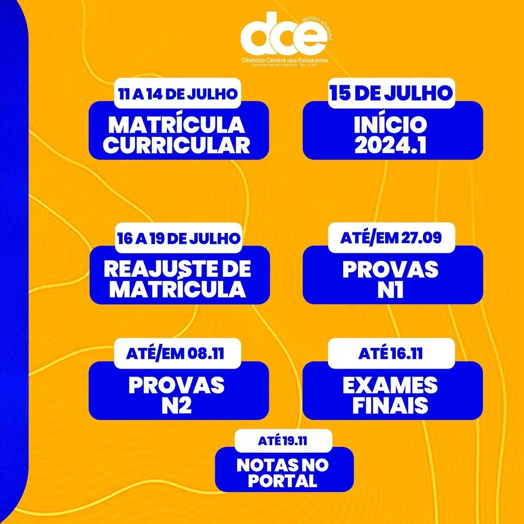 Na quinta-feira (11) iniciou o período de matrícula curricular. Entre os dias 16 e 19 de julho, será o período de reajuste de matrícula. 27 de setembro é prazo máximo para realização da N1; 08 de novembro: prazo máximo para realização da N2; e 16 de novembro: prazo máximo para realização dos exames finais.