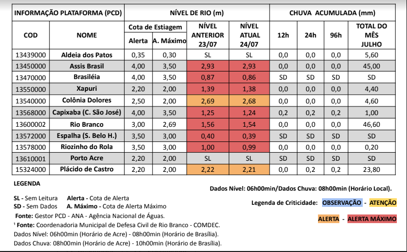 Segundo os dados da Defesa Civil, o nível mais alto registrado foi em 3 de julho, com o manancial medindo 1,86 metros em Rio Branco.