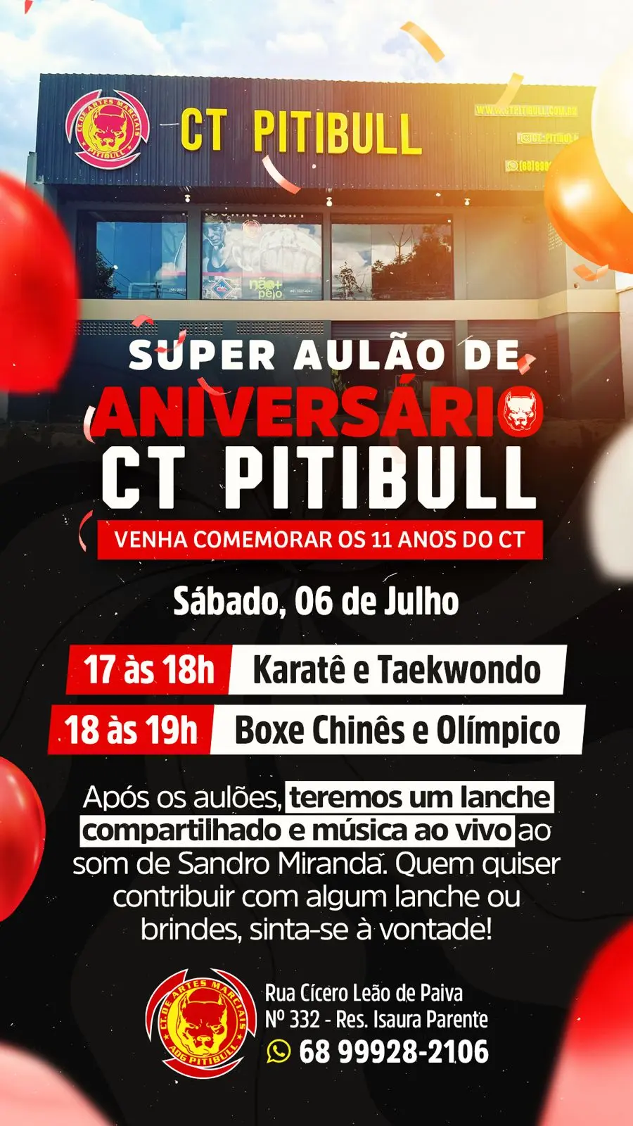 No sábado (06) o CT Pitibull comemora 11 anos de existência e 1 ano nas novas instalações e para comemorar a data será realizado um aulão . Das 17h as 18h aulão de Karate e Taekwondo. Das 18h as 19h aulão de Boxe Chinês e Boxe Olímpico.
