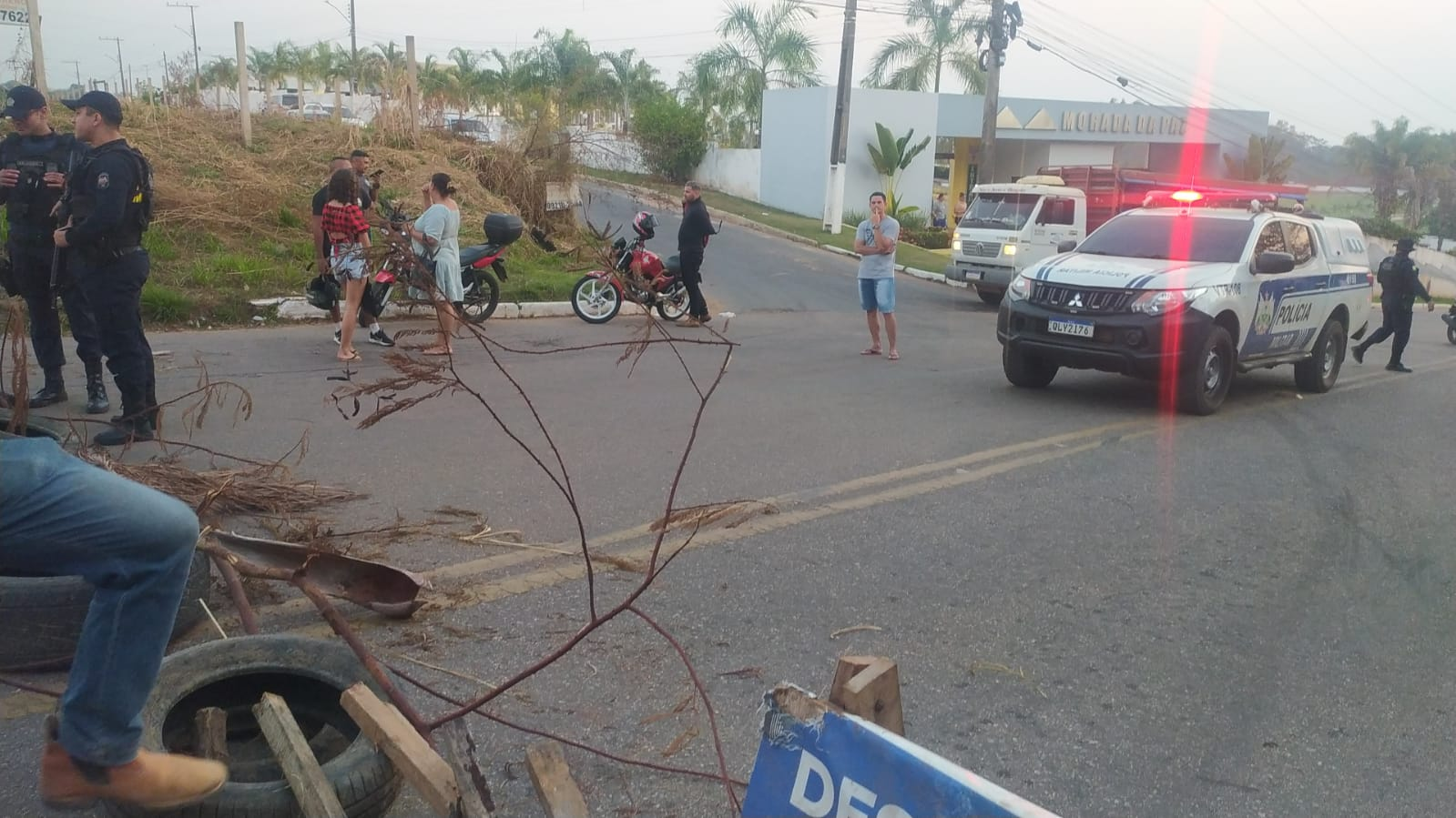Um grupo de manifestantes fechou a estrada do Calafate, em frente ao cemitério Morada da Paz. A reivindicação tange o asfaltamento de ruas no Portal da Amazônia e no Raimundo Maia.