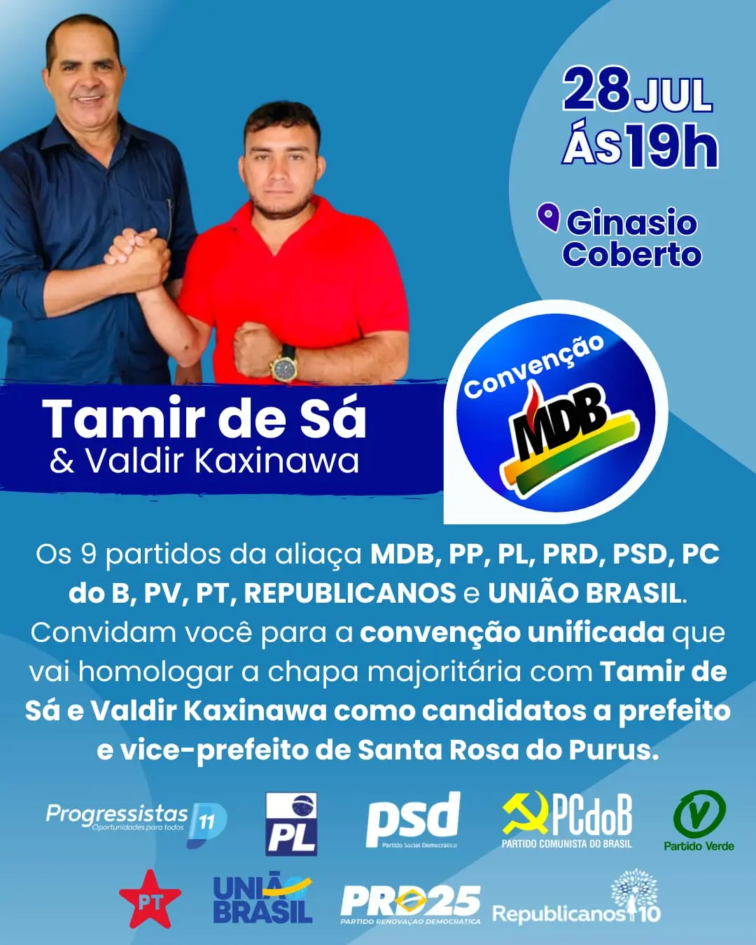 Tamir Sá, candidato à reeleição, conta com um amplo apoio partidário. Sua chapa, que tem Valdir Kaxinawa como vice, será apoiada por nove partidos: MDB, PP, PL, PRD, PSD, PCdoB, PV, PT, Republicanos e União Brasil. A convenção unificada da coligação está marcada para o dia 28 de julho, às 19h, no ginásio coberto.