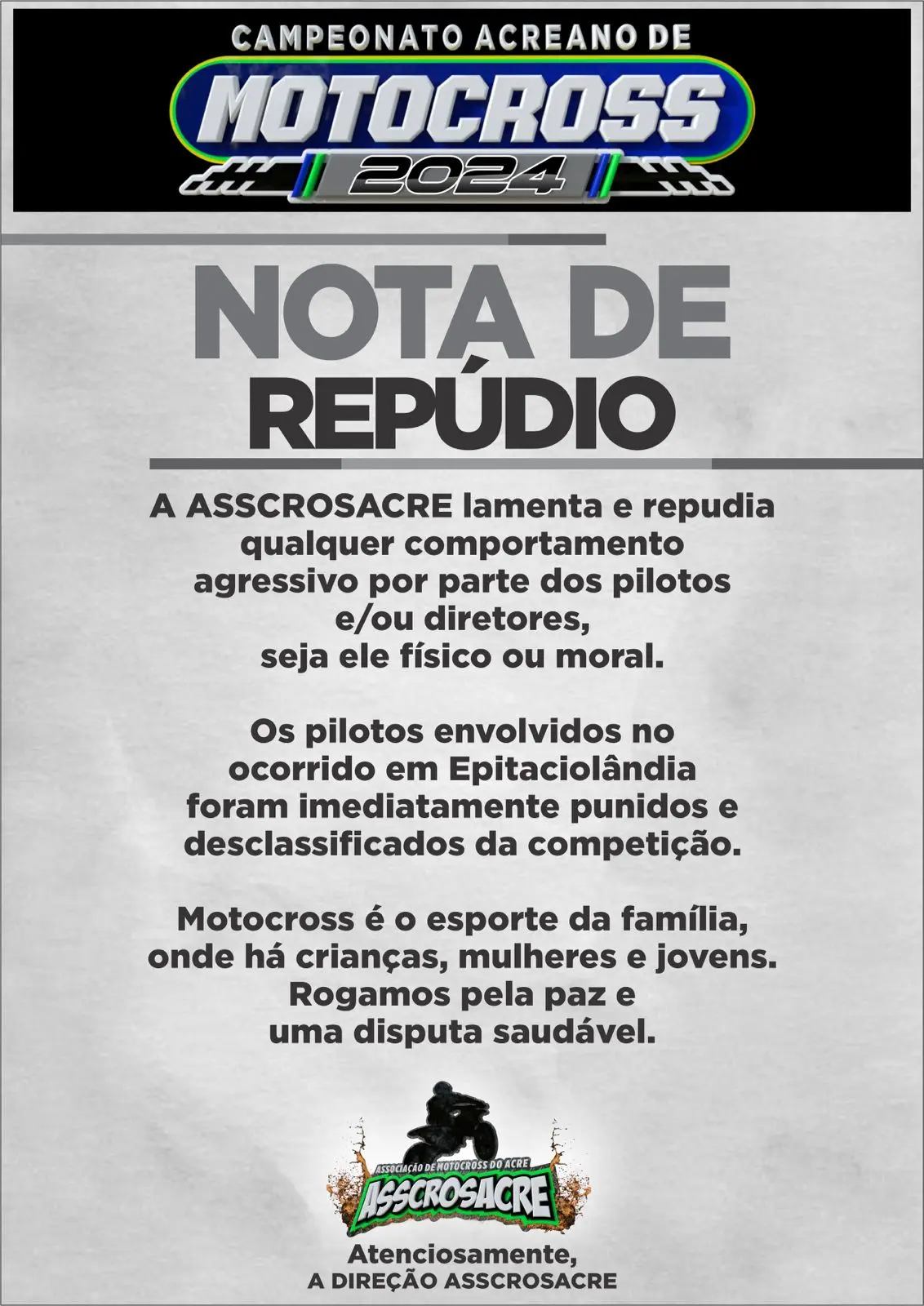 MotoCross é o esporte da família, onde há crianças, mulheres e jovens. Rogamos pela paz e uma disputa saudável.