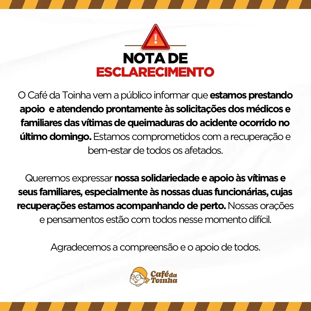 O Café da Toinha, estabelecimento onde se deu o ocorrido, se posicionou acerca da situação através de seu perfil no Instagram, e garantiu que está prestando o devido apoio.  “Seguimos em oração, acompanhando de perto e comprometidos pela recuperação de todos os afetados nesse acidente!”, diz a legenda da publicação.