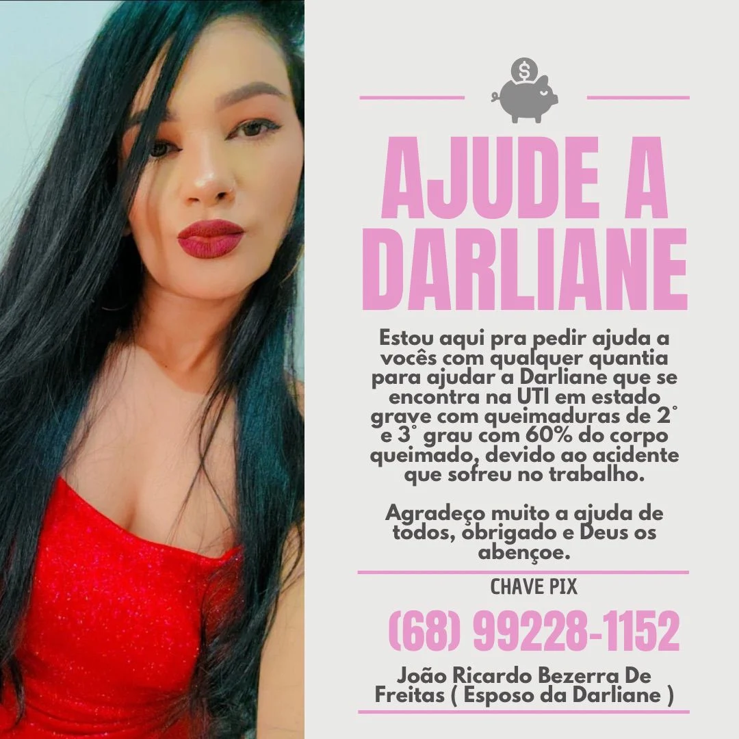 “Estou aqui para pedir ajuda a vocês com qualquer quantia para ajudar Darliane, que se encontra na UTI em estado grave, com queimaduras de 2° e 3º grau em 60% do corpo, devido ao acidente que sofreu no trabalho. Agradeço muito a ajuda de todos, obrigado e Deus os abençoe”, disse João Ricardo, marido da vítima.