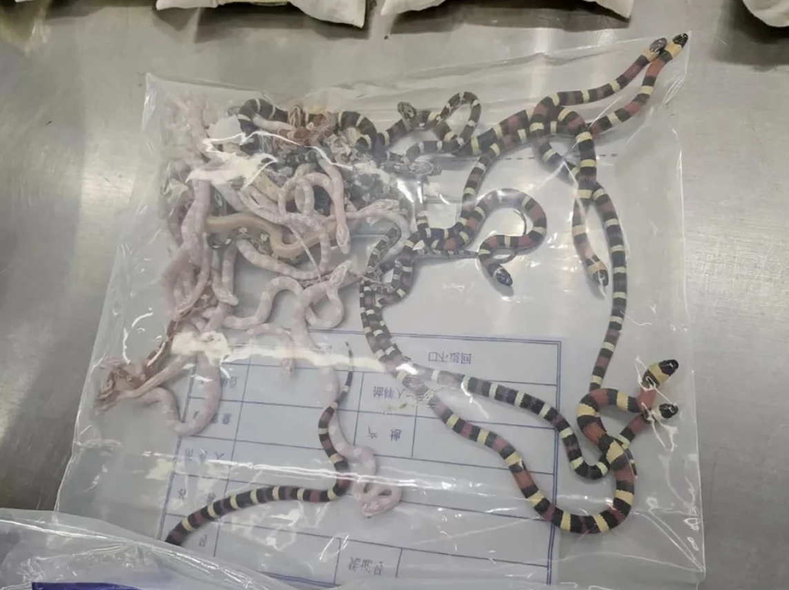 Um homem foi pego tentando contrabandear mais de 100 cobras vivas dentro das calças na China. De acordo com autoridades aduaneiras chinesas, o homem foi parado em um ponto de verificação entre Hong Kong e a China continental.