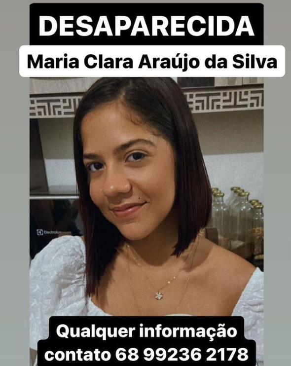 Para qualquer informação sobre o paradeiro de Maria Clara Araújo da Silva, os contatos podem ser feitos pelo telefone: (68) 99236 2178.