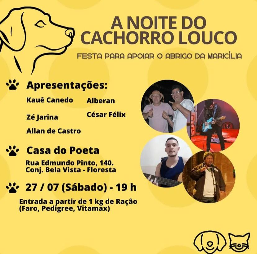 Um evento dedicado à causa animal vai acontecer na Casa do Poeta, na Rua Edmundo Pinto, nº 140, neste sábado (27). A Noite do Cachorro Louco surgiu como meio de ajudar dona Maricília, que atualmente cuida, sozinha, de aproximadamente 80 animais.