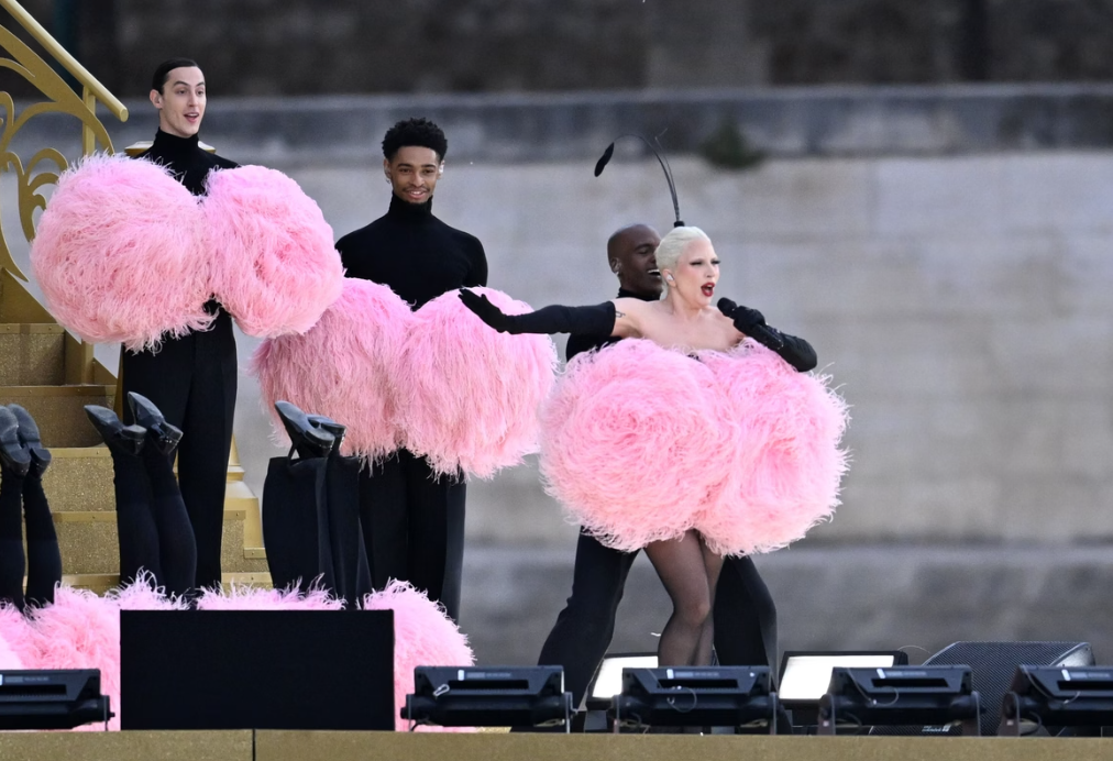 Ainda no início da cerimônia, a cantora Lady Gaga fez sua apresentação cantando em francês. Acompanhada de dançarinos, ela desceu uma escadaria à beira do Rio Sena.