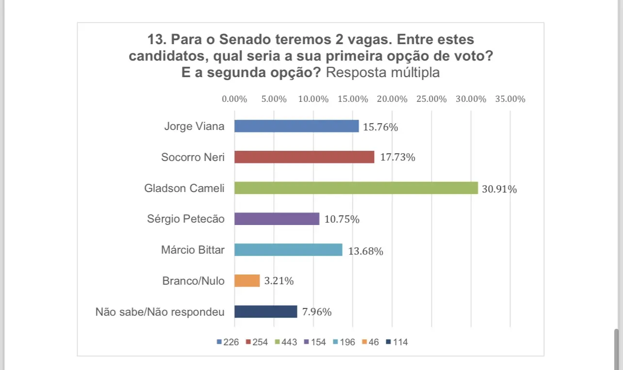 Gladson aparece em 1º lugar, com 30,91% das intenções de voto. Em seguida, a deputada federal Socorro Neri, com 17,73%. O ex-senador e governador Jorge Viana, do PT, figura em 3º lugar na disputa, com 15,76%.