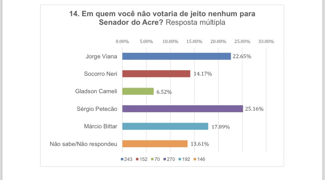 Petecão também lidera a rejeição de votos, segundo a pesquisa. O senador lidera o ranking com 25,11% das rejeições. Em seguida, aparece o atual presidente da Apex Brasil, Jorge Viana, com 22,65% de rejeição.
