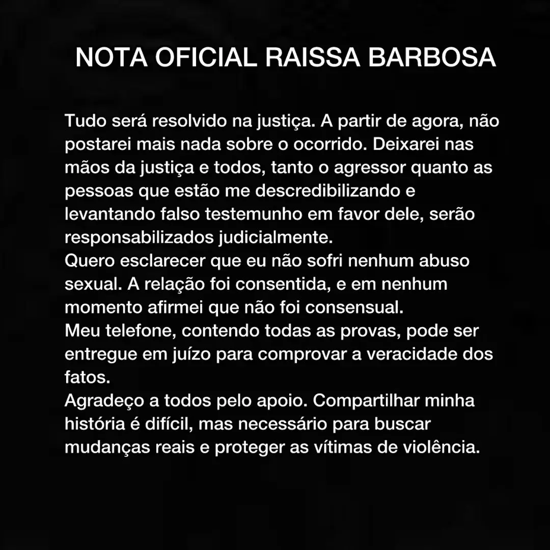 Ela continua esclarecendo que, não sofreu nenhum abuso sexual. A relação foi consentida, e em nenhum momento Raissa afirmou que não foi consensual.