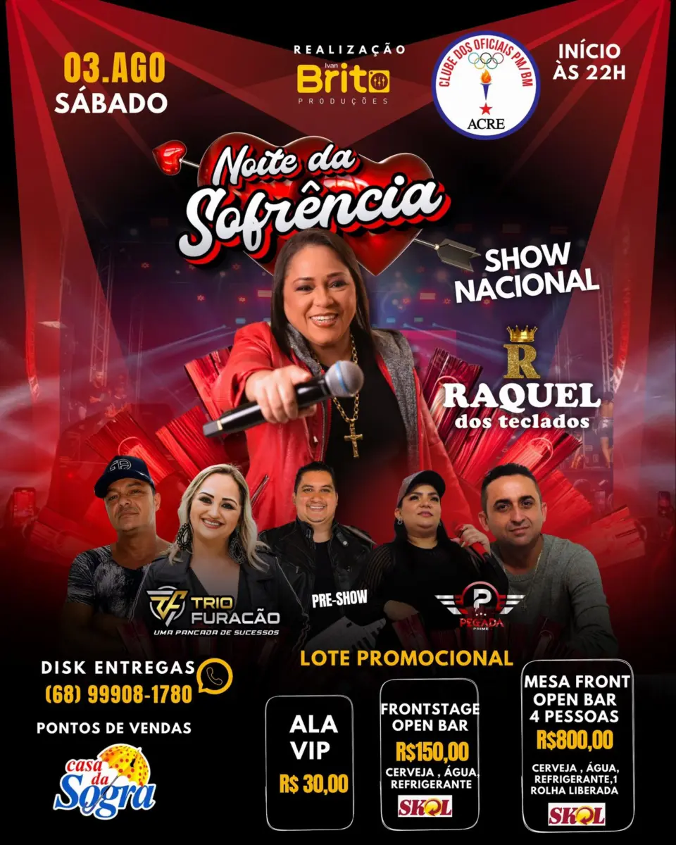 O evento, organizado por Ivan Brito Produções, contará também com  pré-show do Trio Furacão e Banda Pegada Prime. Em entrevista à coluna, Ivan Brito revelou a alta expectativa tanto da produção quanto do público, com uma previsão de aproximadamente 2 mil participantes. “Estamos muito animados com a vinda da Raquel dos Teclados para Rio Branco. A ‘Noite da Sofrência’ será um evento inesquecível e esperamos que todos possam aproveitar cada momento”, disse Ivan Brito.