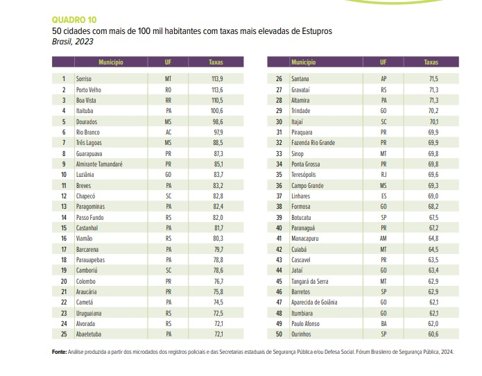 Os dados do Anuário Brasileiro de Segurança Pública de 2024 já foram divulgados nesta quinta-feira (18), e nele a cidade de Rio Branco aparece em sexto lugar no ranking de municípios com mais casos de estupro, contabilizando apenas aqueles com mais de 100 mil habitantes, em 2023.