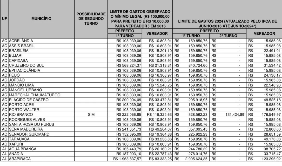 Em seguida, aparece Sena Madureira, com um limite de R$ 72.800,60. O top 3 fecha com Tarauacá e Plácido de Castro, onde cada vereador poderá gastar até R$ 49 mil na campanha deste ano.