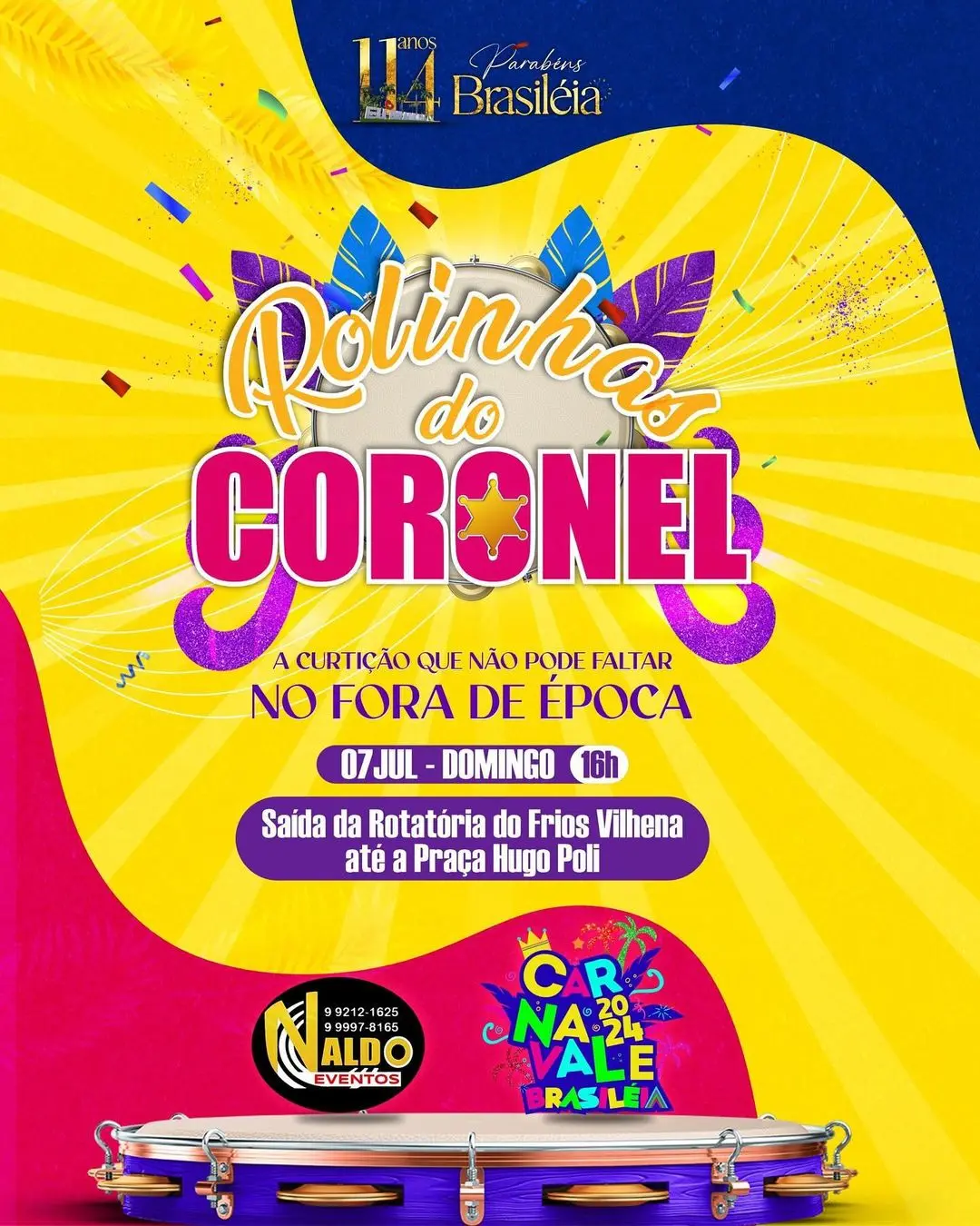 Segundo a programação, o bloco Rolinhas do Coronel sai às 16h da rotatória do Frios Vilhena e percorre até a praça Hugo Poli. O Carnavale é o carnaval fora de época que acontece em Brasiléia e faz parte da comemoração do aniversário de 114 anos da cidade.