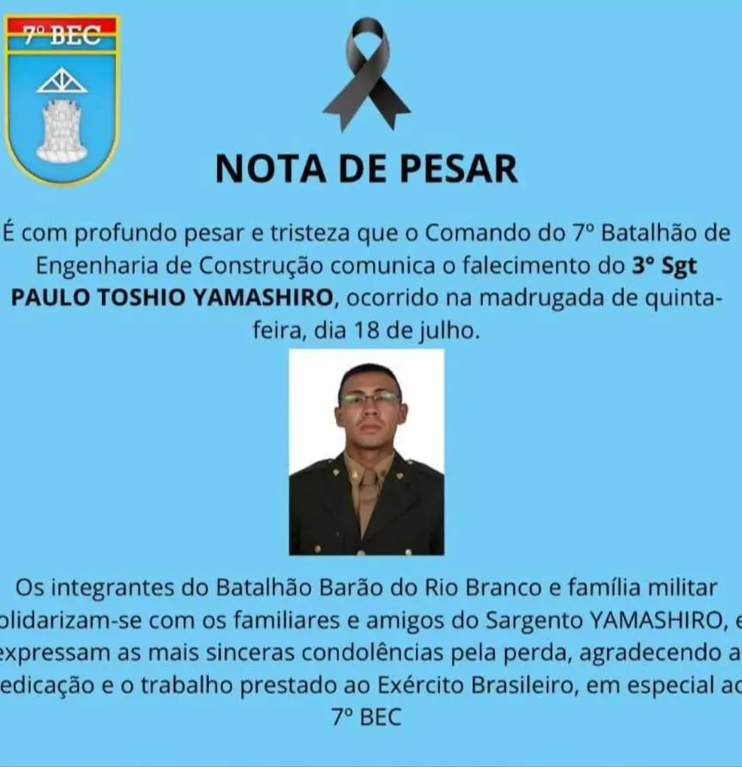 O terceiro sargento do 7º BEC, Paulo Toshio Yamashiro, que perdeu a vida após ser atingido por uma motoniveladora da unidade militar, estava integrando a equipe de readequação e ampliação da pista do aeródromo do município de Santa Rosa do Purus. O acidente trágico aconteceu na manhã desta quinta-feira (18).