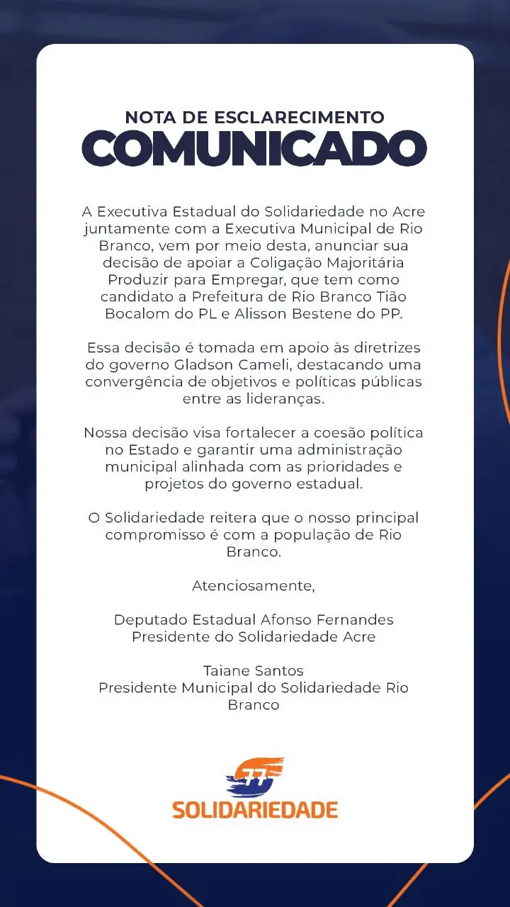 A executiva estadual do Solidariedade, comandada pelo deputado estadual Afonso Fernandes, anunciou nesta quinta-feira (25) apoio à chapa de Tião Bocalom (PL-AC) e Alysson Bestene (PP-AC) à Prefeitura de Rio Branco. O anúncio foi feito por meio de nota.