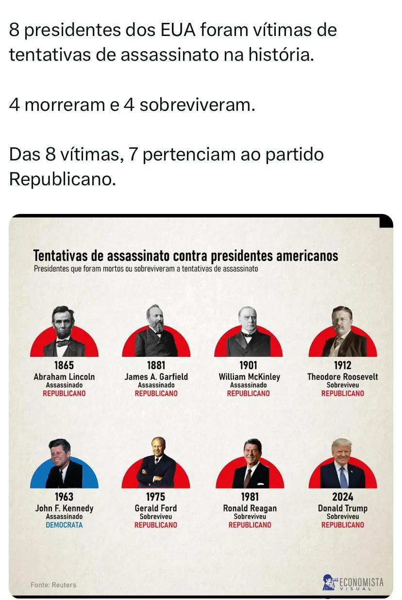 Trump entrou para a lista dos ex-presidentes norte-americanos que, mesmo feridos, sobreviveram. Trump escapou com um ferimento leve, na orelha e deixou o local do atentado, cercado por guardas-costa do Serviço Secreto americano, fazendo o tradicional gesto de soco no ar, com o punho direito cerrado, como uma demonstração de força. Outros quatro ex-presidentes não tiveram a mesma sorte.