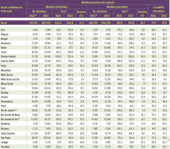 Em 2022, sobre as medidas distribuídas, a taxa foi de 835.1. No ano seguinte, o número disparou e atingiu 1128,6.