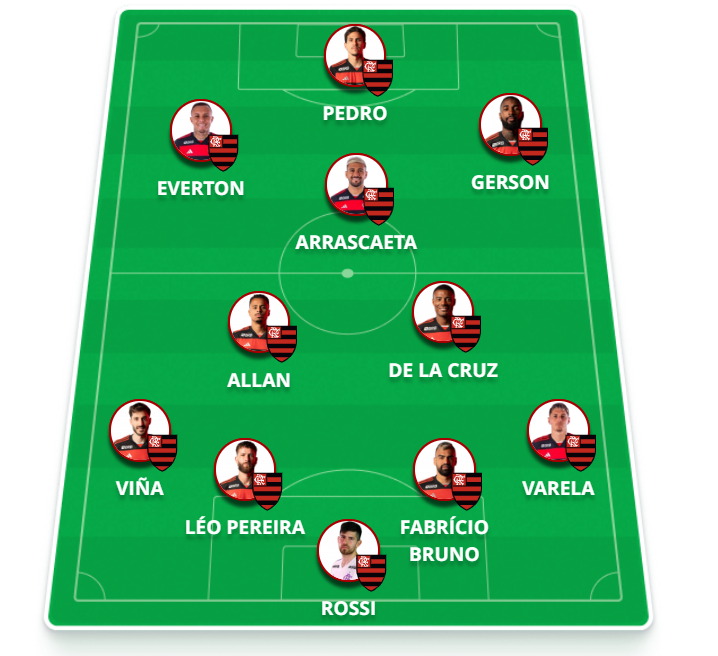 Escalação provável: Rossi, Varela, Fabrício Bruno, Léo Pereira e Viña; Allan, De la Cruz e Arrascaeta; Gerson, Everton Cebolinha e Pedro.