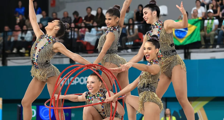 Os conjuntos são compostos por cinco ginastas, que realizam duas séries, uma sendo todas com o mesmo aparelho. Nesta Olimpíada, serão cinco arcos, ou uma série com aparelhos mistos, sendo duas bolas e três fitas em Paris 2024.
