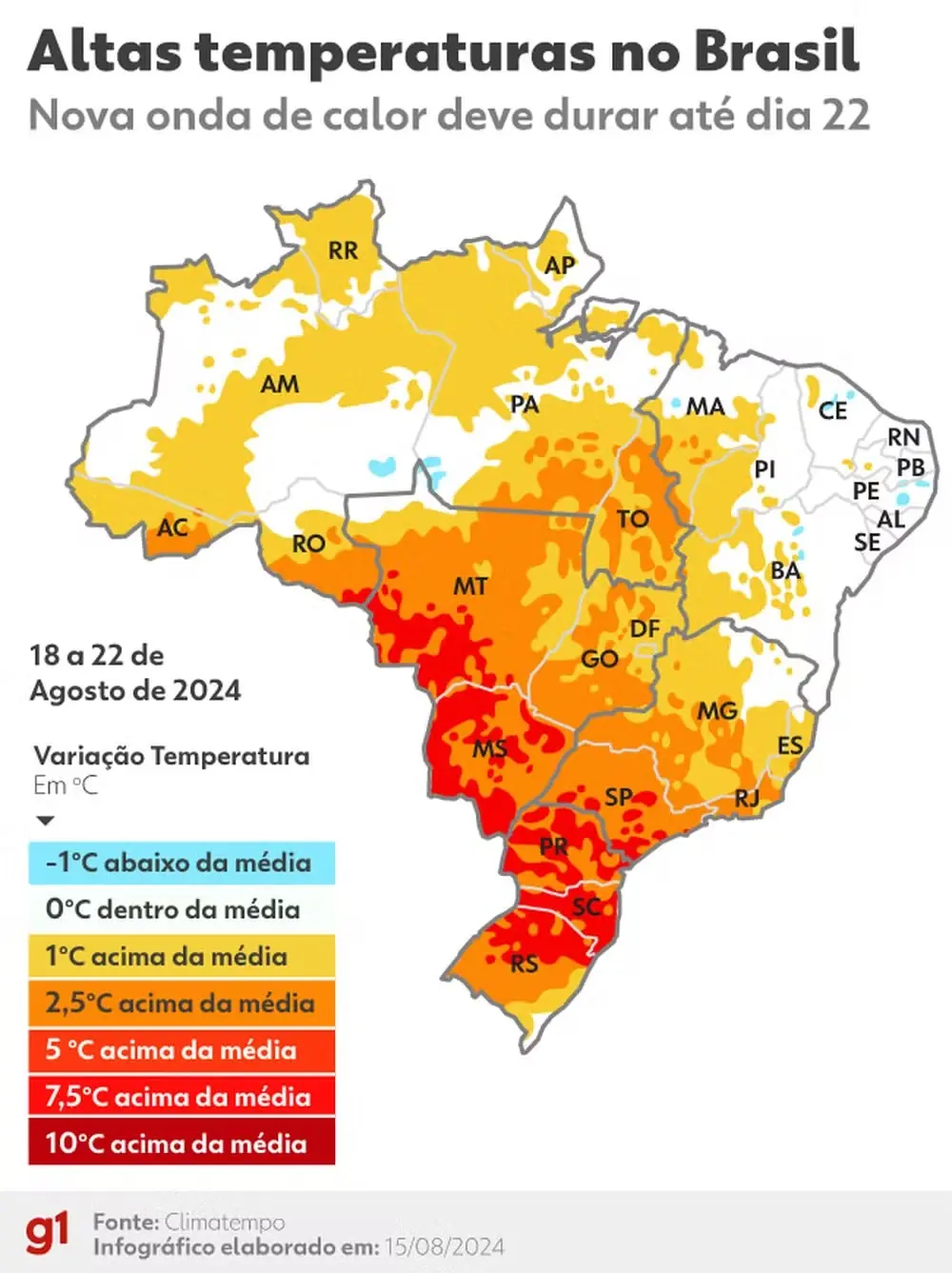 O fenômeno deve ser semelhante às últimas ondas de calor que aconteceram no país. O sistema intensifica a circulação de ventos quentes no interior do país, impedindo o avanço de frentes frias. Segundo a Climatempo, o calor deve ganhar mais força a partir de sábado (17), com as temperaturas aumentando gradativamente ao longo dos dias. A expectativa é que a onda de calor se estabeleça no domingo (18) e se estenda até a próxima quinta-feira (22).