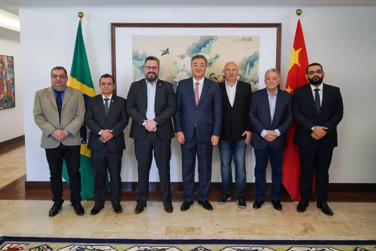 Senador Alan Rick, Embaixador Zhu Qingqiao, e membros da comitiva acreana posam juntos após a reunião sobre investimentos e desenvolvimento estratégico entre Brasil e China/Foto: Ascom
